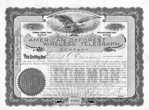 He formed a wireless telegraph company and teamed with Abe White, a stock promoter of dubious reputation. The company, while successful, ran afoul of the law, and de Forest resigned as its president: In a November 28, 1906 letter from de Forest on American De Forest Wireless Telegraph Company letterhead, he writes “Gentlemen, I herewith tender my resignation as vice president and as director of the American de Forest Wireless telegraph Company, the same to take effect immediately.” On the carbon copy saved in the de Forest papers he added to the formal typed letter in his own hand, “This is the funeral of my first born child! This is the finis to the hopes and efforts which has made up my strenuous life for the first five years. That which I had wrought with the fair and ceaseless endeavor to make grand and lasting and triumphant is frustrated, sand-bagged, throttled and despoiled by the robber who has fattened off my brains. But my work goes on while I live.”