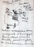 Above, left, de Forest seated, Abe White standing, at the St Louis World’s Fair of 1904. Above, the de Forest building at the fair. Below, a coherer was the first wireless detector.